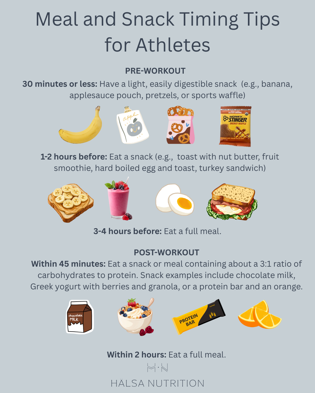 Don’t forget snacks! Meals are important, but snacking throughout the day will help you feel and perform your best. Most athletes benefit from 3 meals a day plus 3-4 snacks, depending on training load, schedule, and goals. After exercise, many athletes experience a temporary decrease in appetite. While intuitive eating is valuable, training can sometimes mask hunger. In these cases, it is important to eat intentionally to support recovery. To make sure you are eating enough, aim to eat at least 45 grams of carbohydrates and 15-30 grams of protein after exercising.
